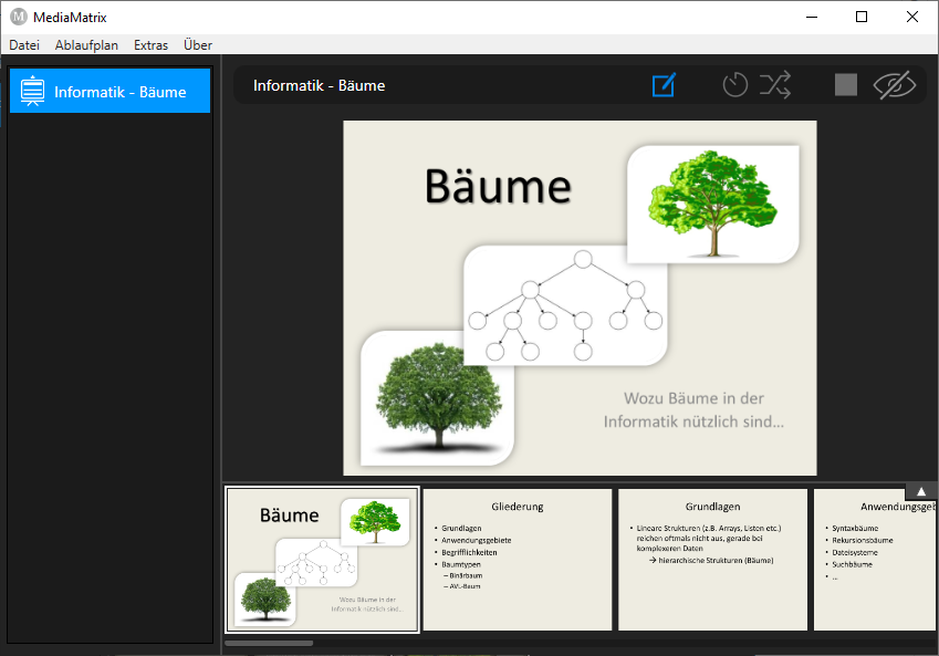 Über das blaue Bearbeitungssymbol in der Steuerleiste (oder E) lässt sich die aktuelle Präsentation direkt in PowerPoint zur Bearbeitung öffnen. Speichert man die Präsentation in Powerpoint ab, so kann man die aktuelle Version mit F5 (aktualisieren) in MediaMatrix öffnen.